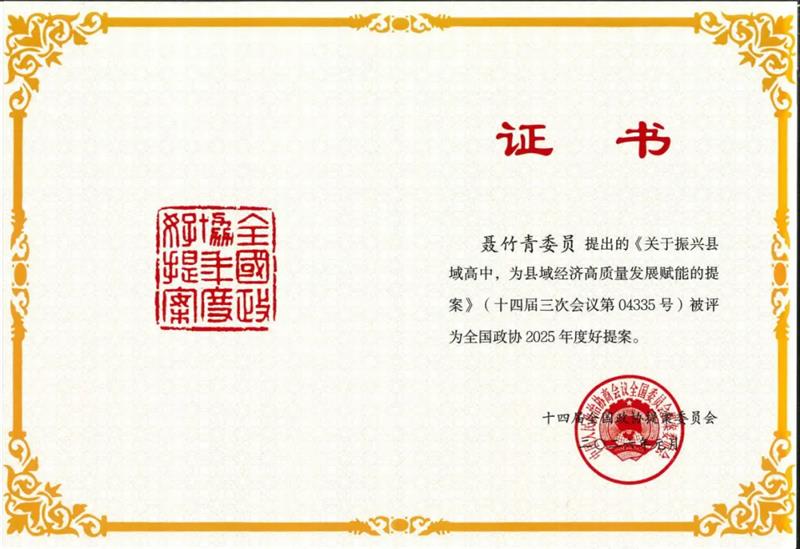 3月3日,全国两会召开前夕,全国政协委员、鹏信集团董事长聂竹青领取了全国政协2025年度“好提案”证书。此前,全国政协官网公布了2025年度“好提案”名单,聂竹青委员撰写的《关于加大振兴县域高中支持力度,为县域经济高质量发展赋能的提案》成功获评。