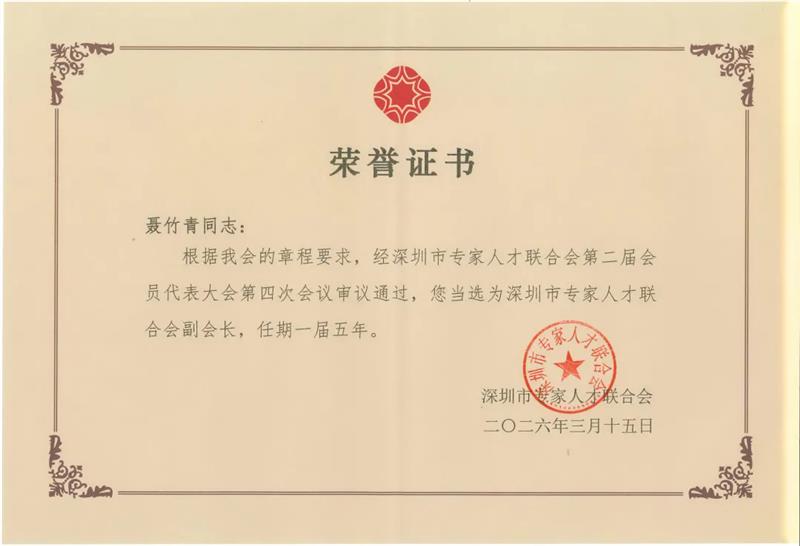 会议期间经投票选举,董事长聂竹青增选为深圳市专家人才联合会副会长。